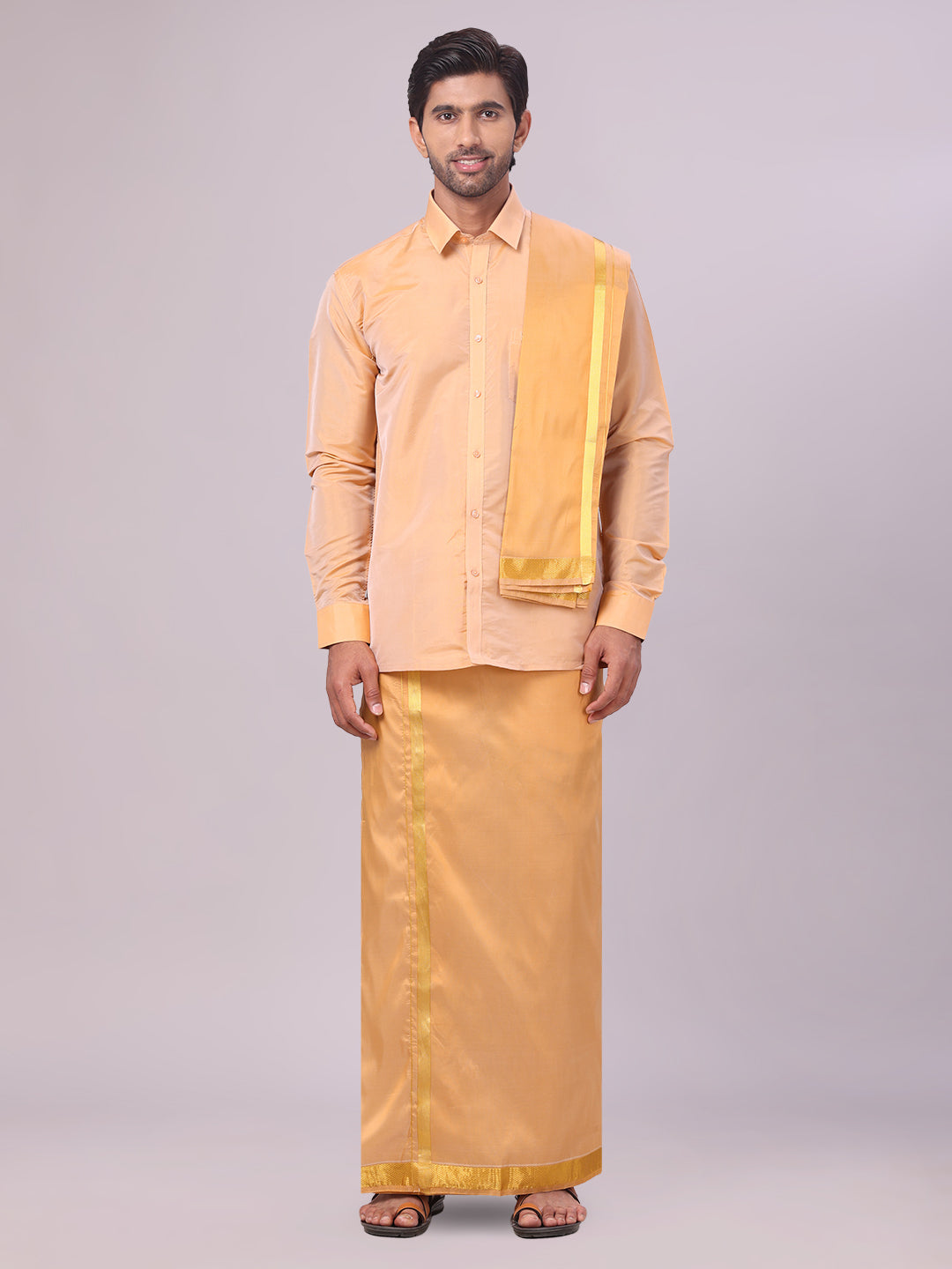 Mens Art Silk Dark Gold Full Sleeves Shirt with Gold Jari Border Dhoti & Towel Combo Blush & Towel Combo Blush