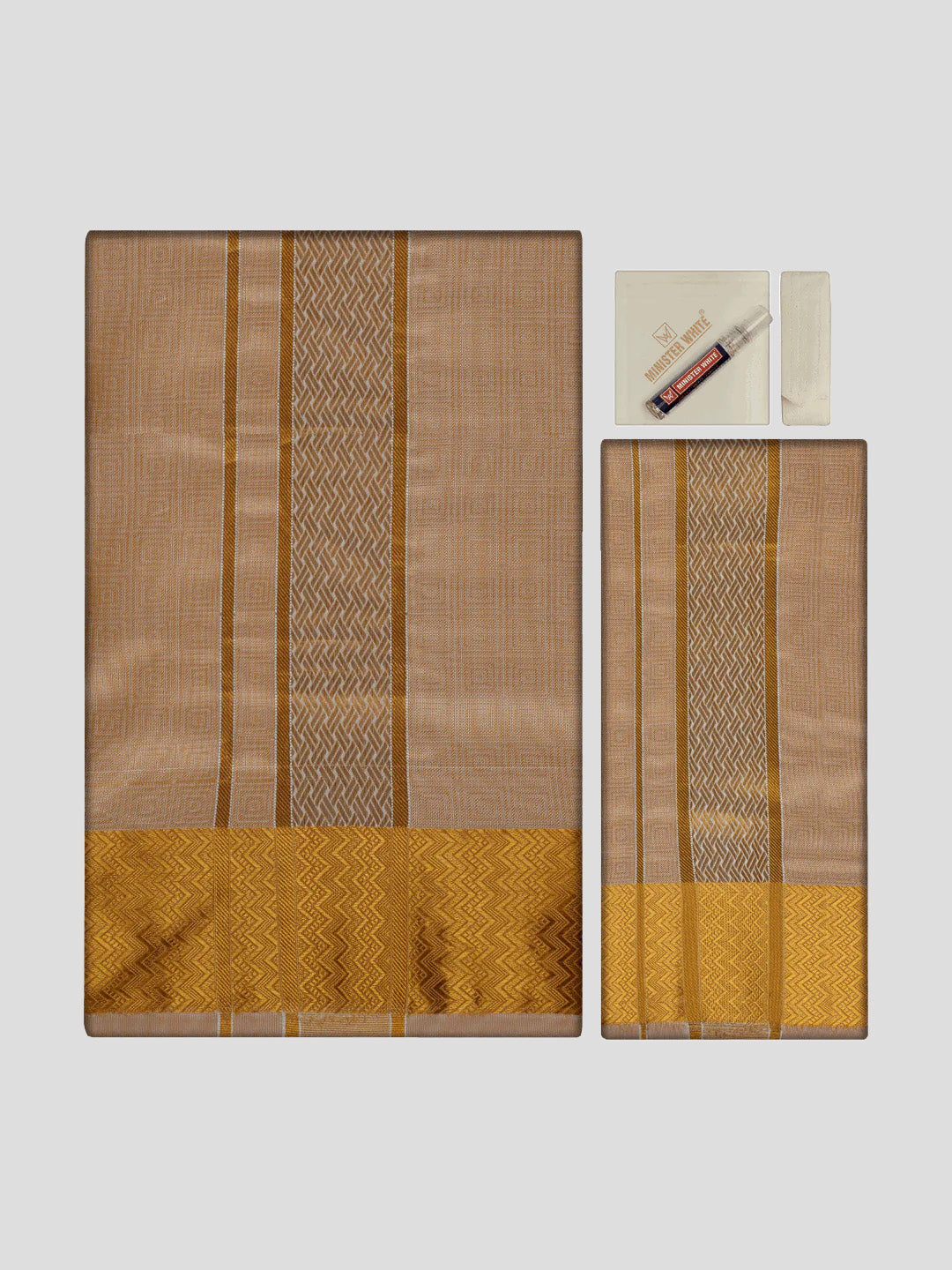 This combo is specially made for the groom to look perfect with premium art silk combos that have new color shades. Traditional groom's wedding set should be modern, stylish, unique, and elegant. Minister White always provides the best South Indian wedding dress for men who respect our cultural and ethnic values. Also, these Art Silk comes with artistic patterns that look luxurious for the most important day.