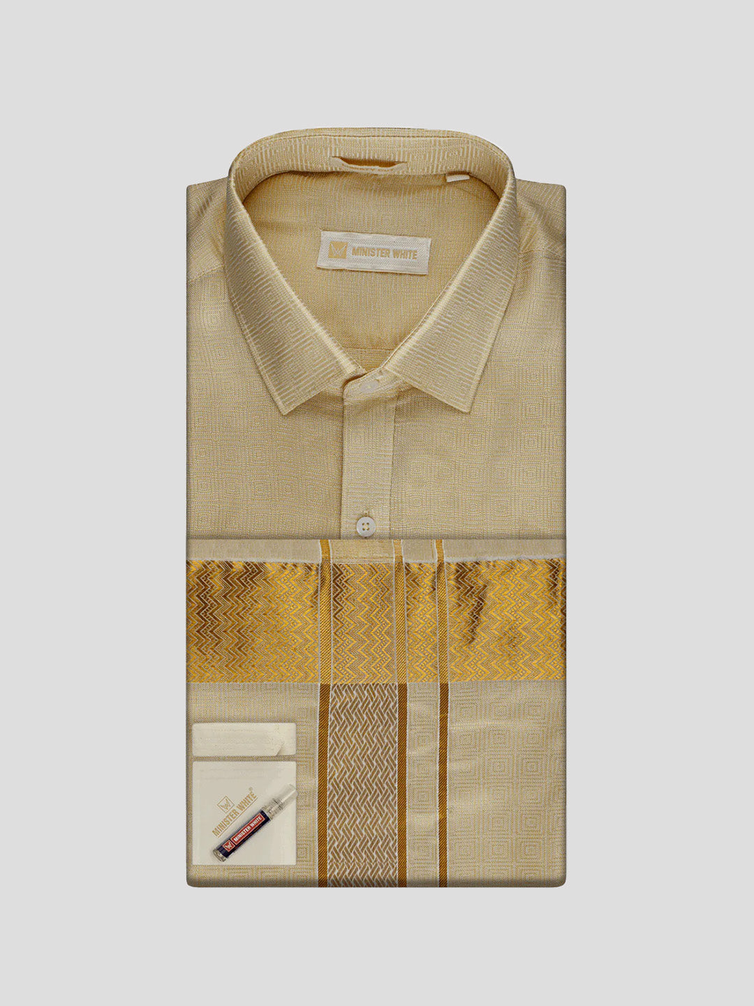 Art Silk Fawn Gold Shirt, Gold Border Dhoti & Towel Combo
