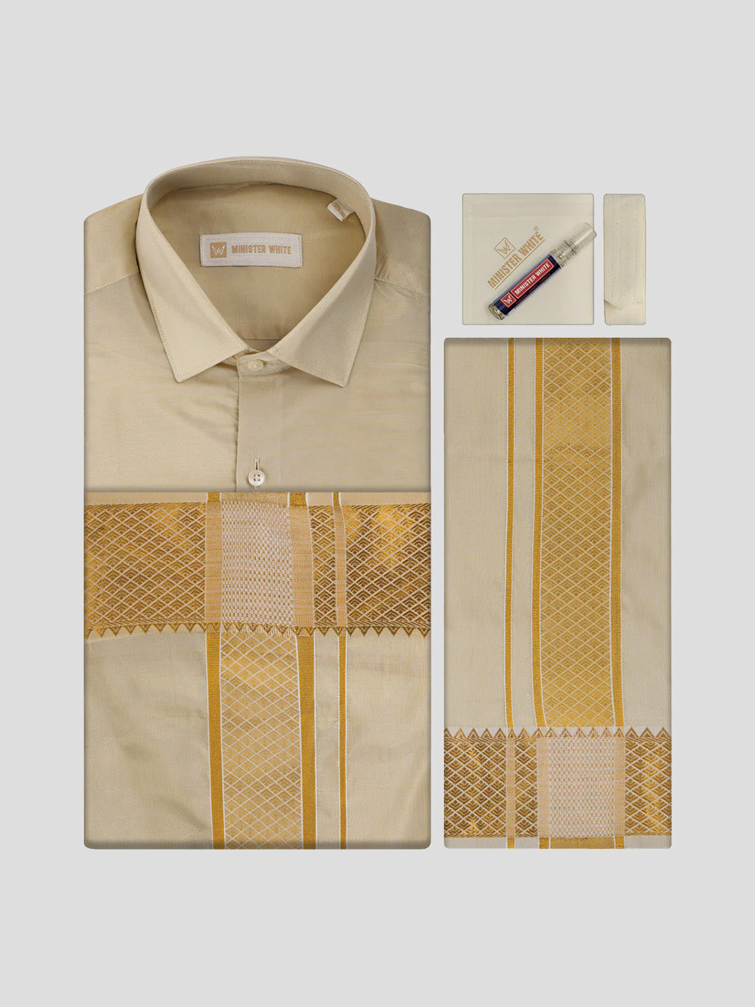 Men's Art Silk Medium Gold Jacquard Full Sleeves Shirt with 3" Gold Jari Border & Towel Dhoti Combo Mangal