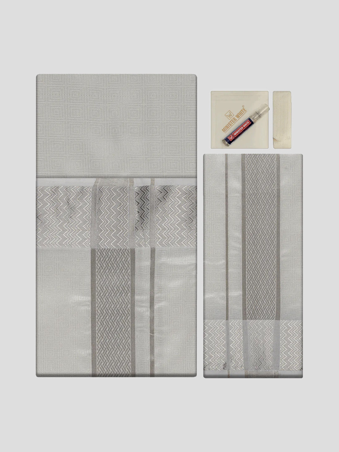 Description of Men's Art Silk Off White Jacquard Full Sleeves Shirt with 2 1/2" Silver Jari Border & Towel Dhoti Combo Nautica