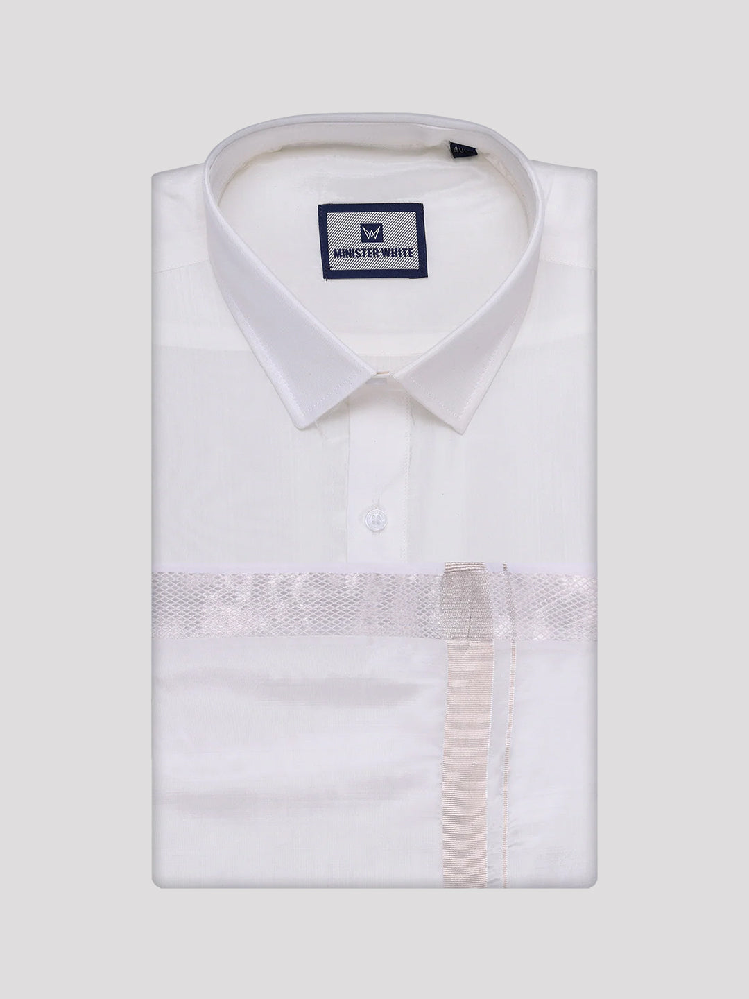 Specification Of Men's Art Silk Off White Full Sleeves Shirt with Silver Jari Border Dhoti Combo Finesse