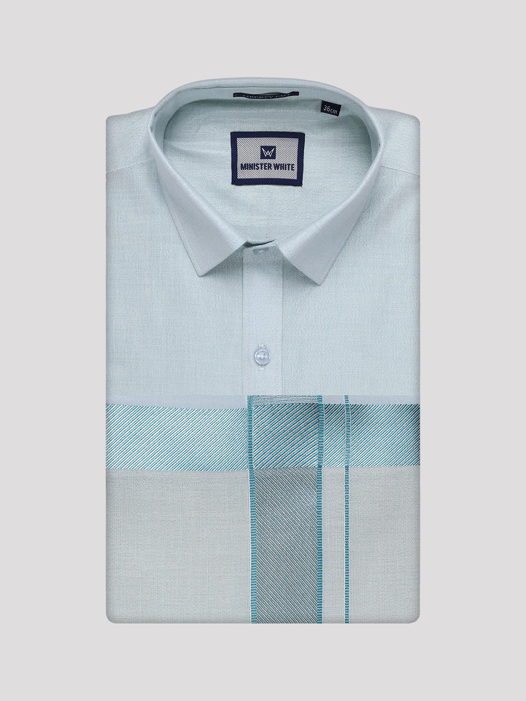 Specification of Men's Mint Blue Tissue Shirt and Dhoti Set with Intricate Jacquard Border Plum
