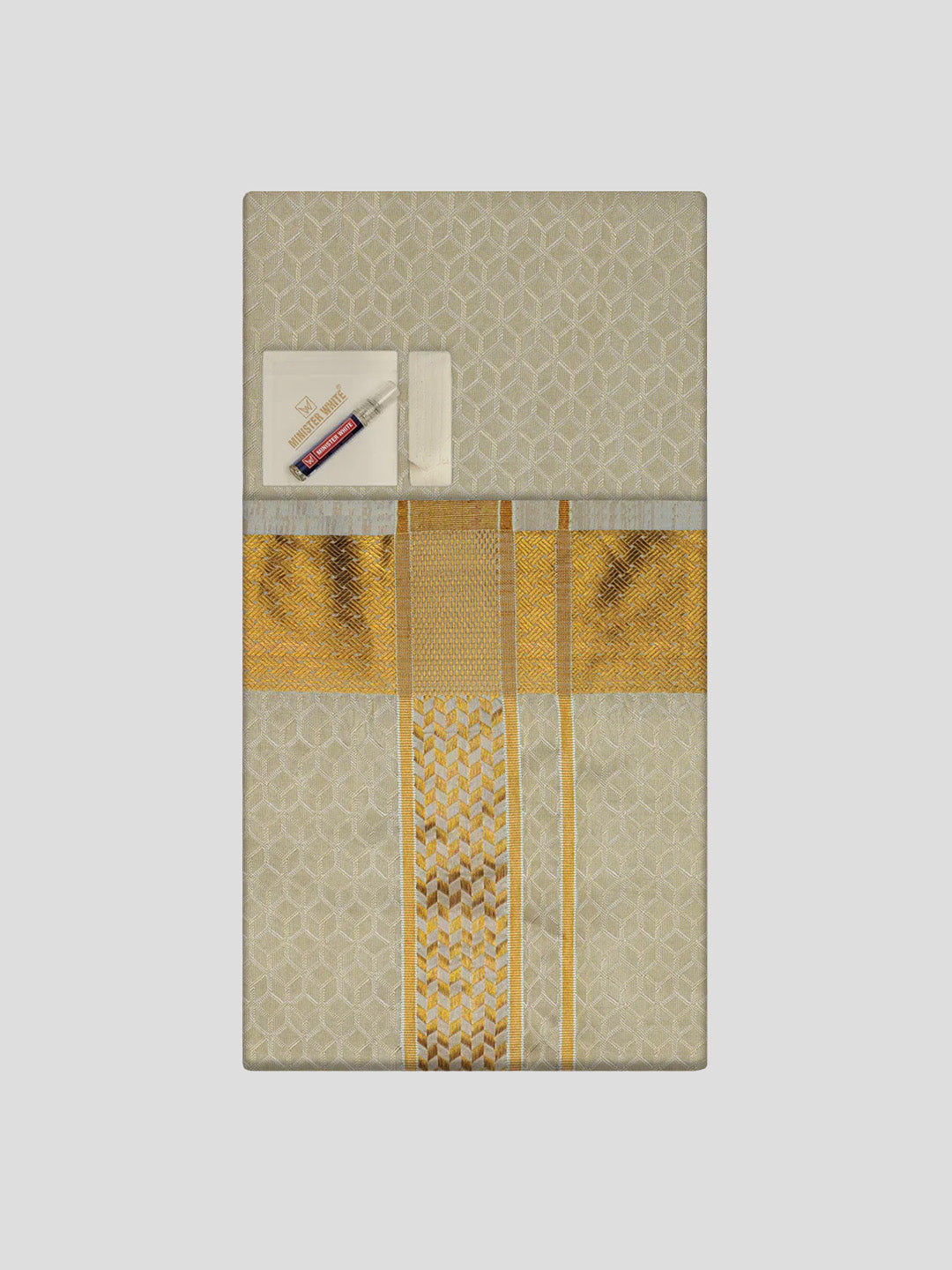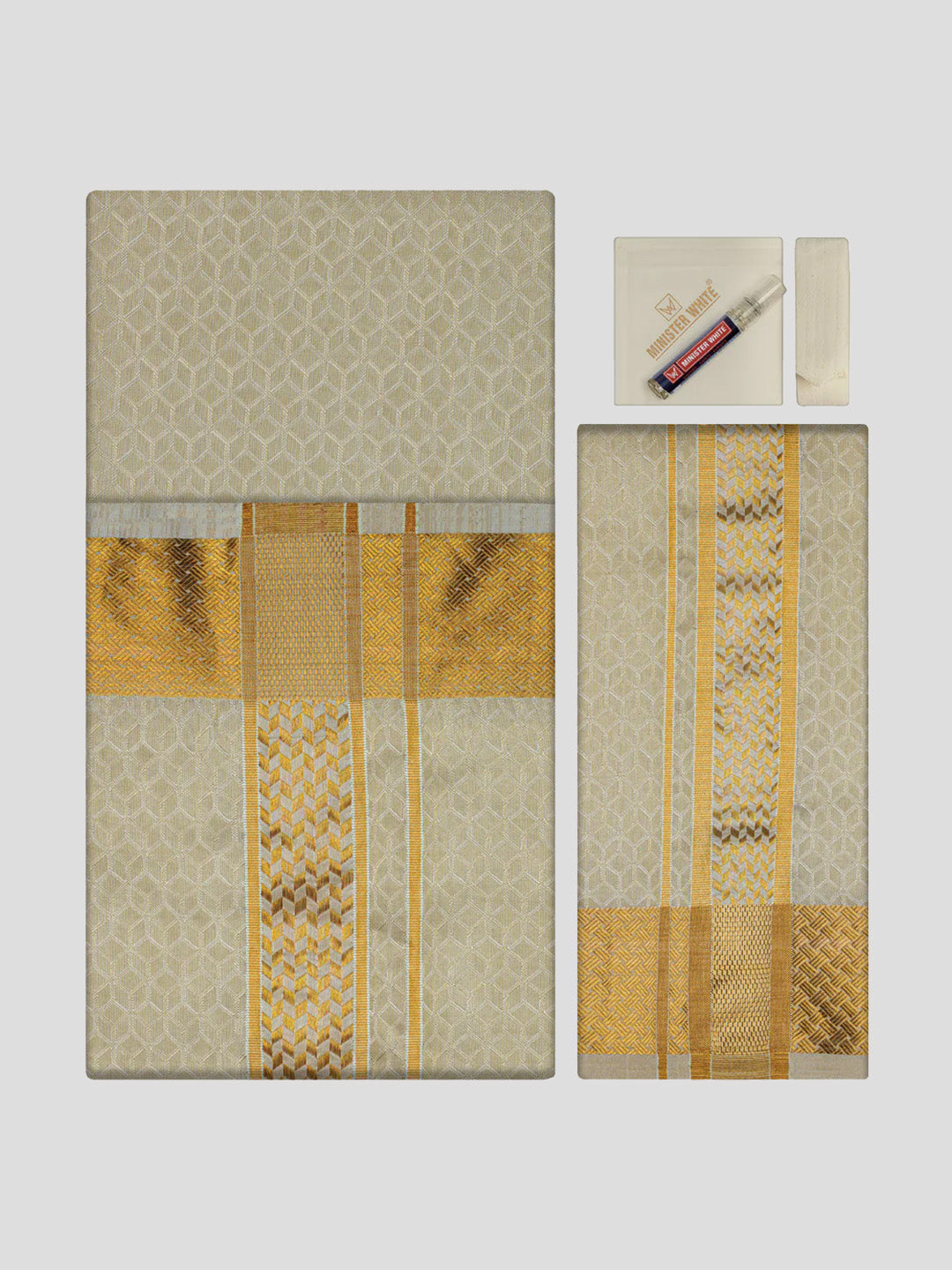 Men's Premium Art Silk Cream Shirt Bit with 2 1/2" Gold Jari Border Dhoti Towel Combo Sweden