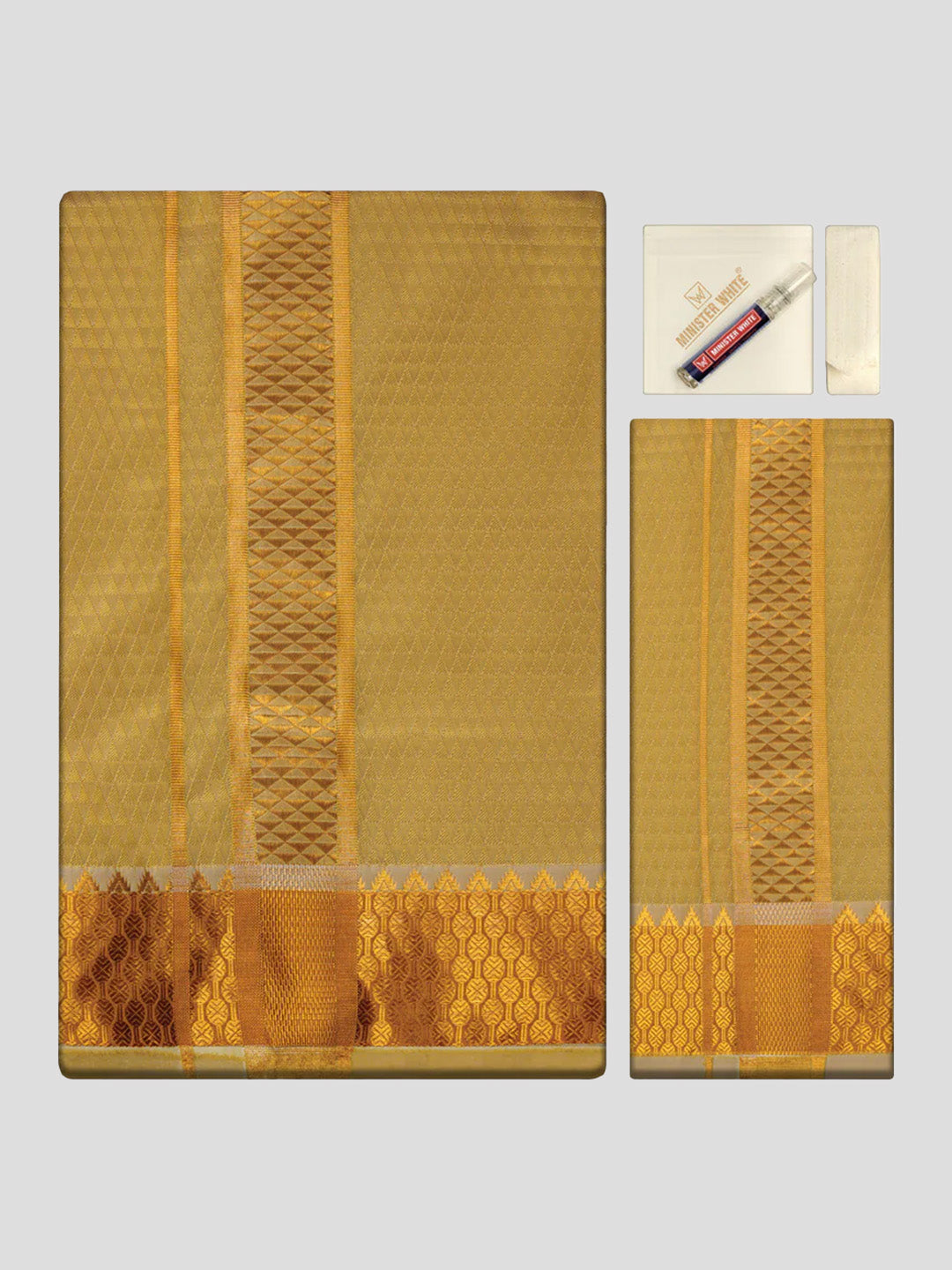 Celebrate tradition with our men's premium art silk colour shirt bit with a gold jari border dhoti and towel combo. The shirt bit features a soft art silk fabric, ideal for tailoring into a festive shirt. Paired with a classic white dhoti detailed with a gold jari border for a royal finish. Includes a matching towel (angavastram) to complete your traditional attire. Perfect for weddings, temple visits, and special cultural occasions.