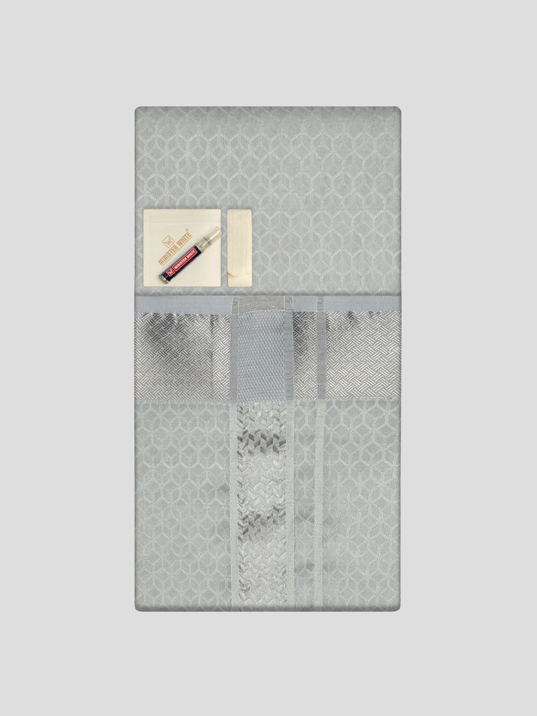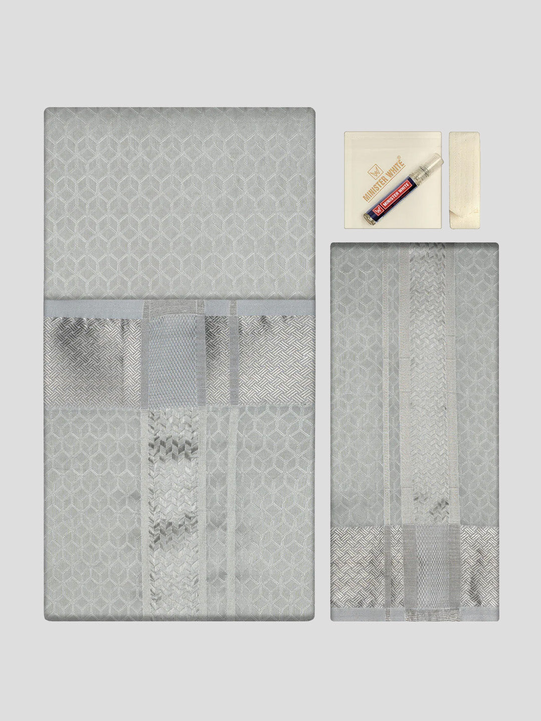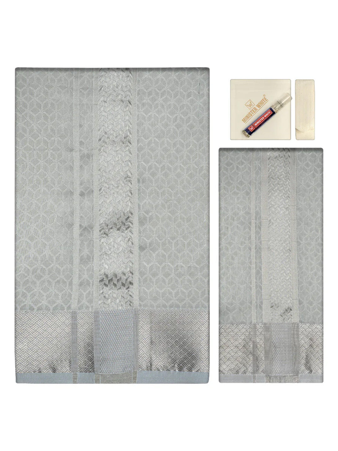 Men's Premium Art Silk Silver Shirt Bit with 2 1/2" Silver Jari Border Dhoti Towel Combo Sweden