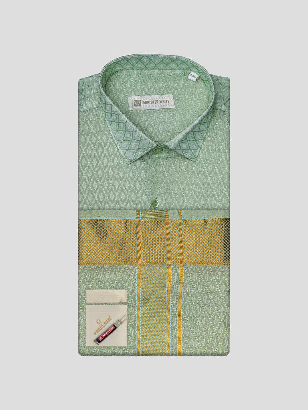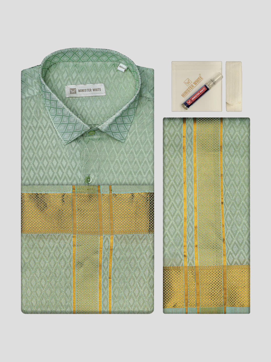 Mens Art Silk Pista Full Sleeves Shirt with 2 1/2" Gold Jari Border & Towel Dhoti Combo Spruce