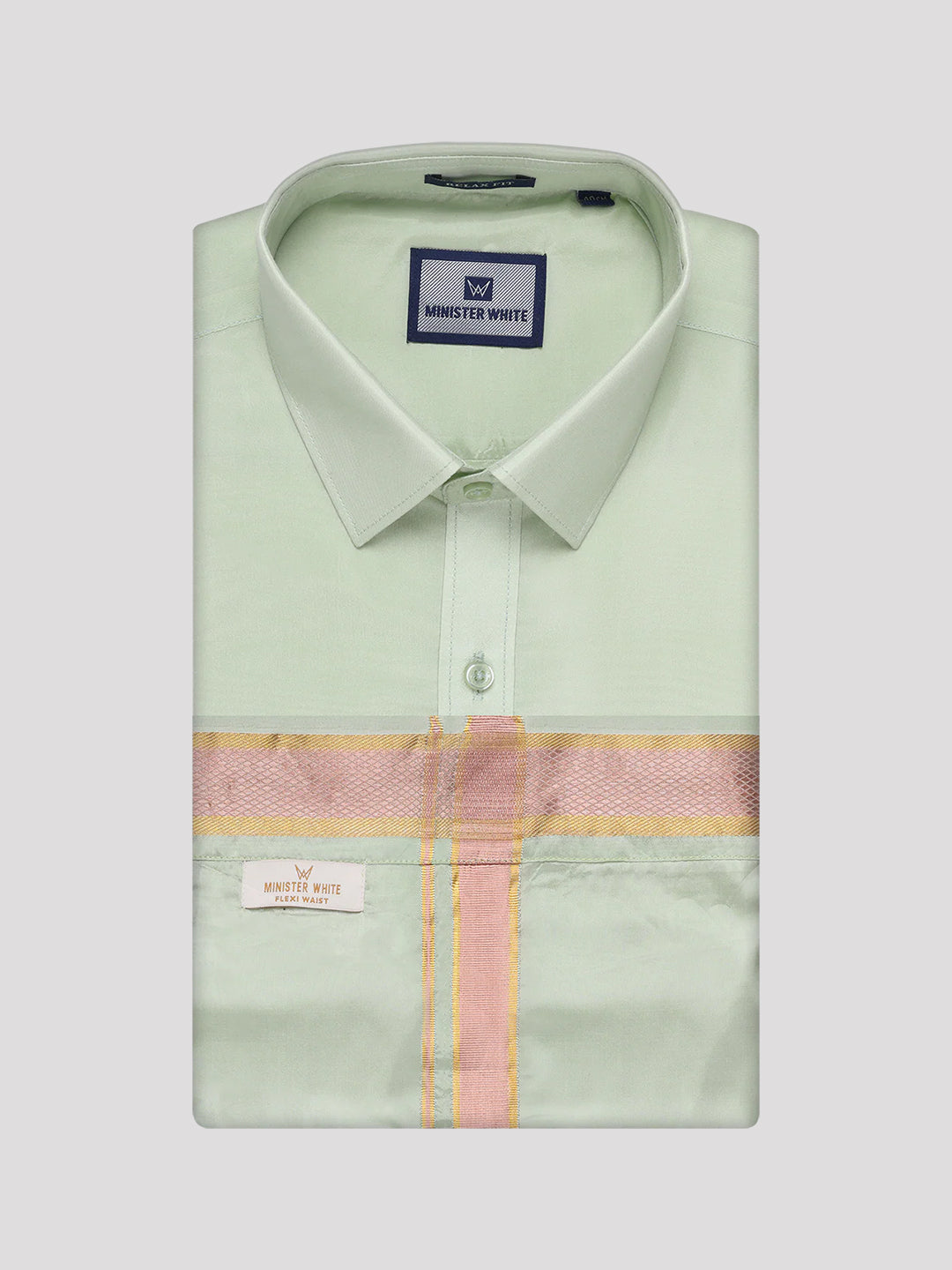 Specification Of Mens Art Silk Pista Green Full Sleeves Shirt with Gold Jari Border Flexi Dhoti Combo Finesse