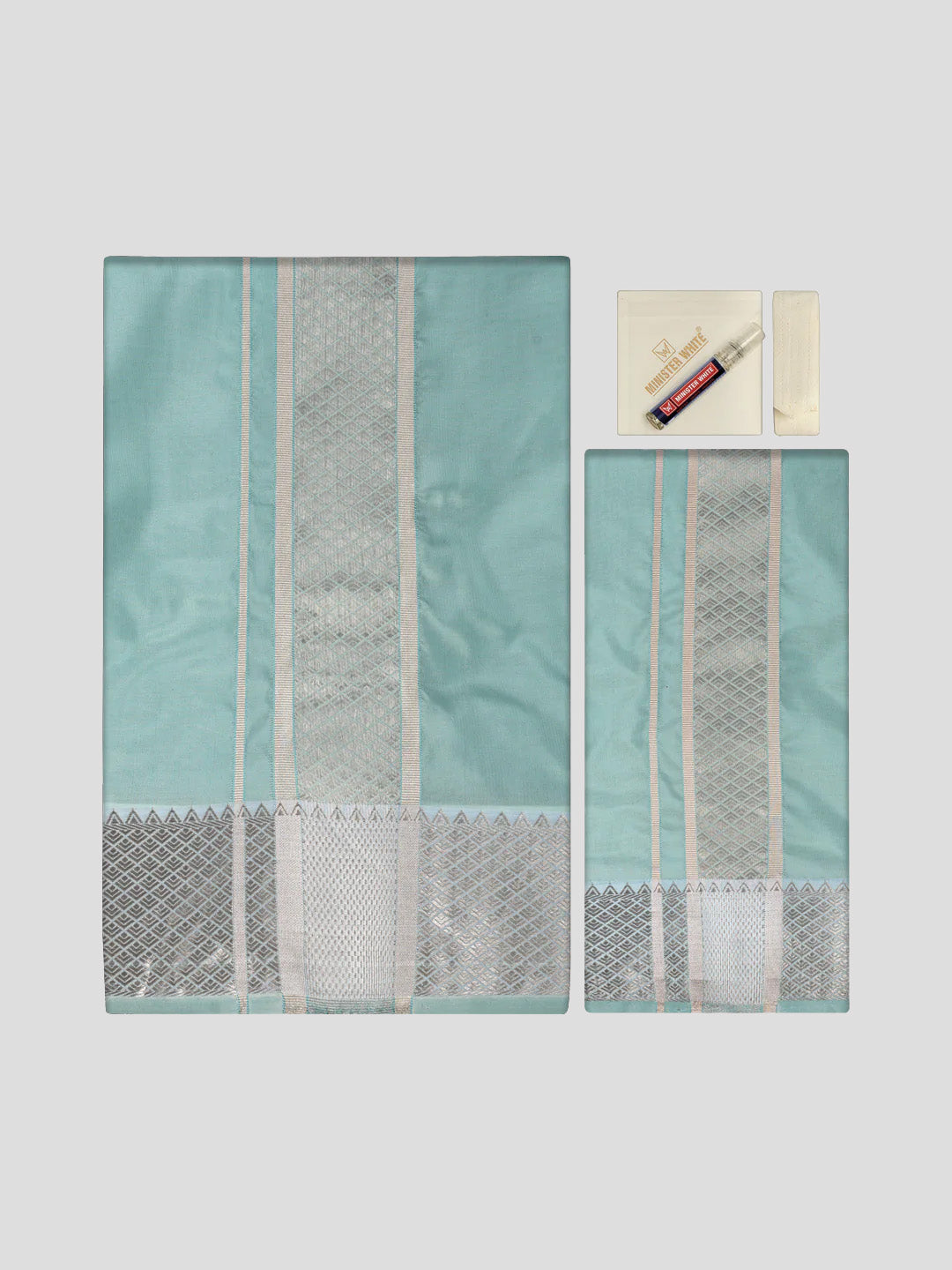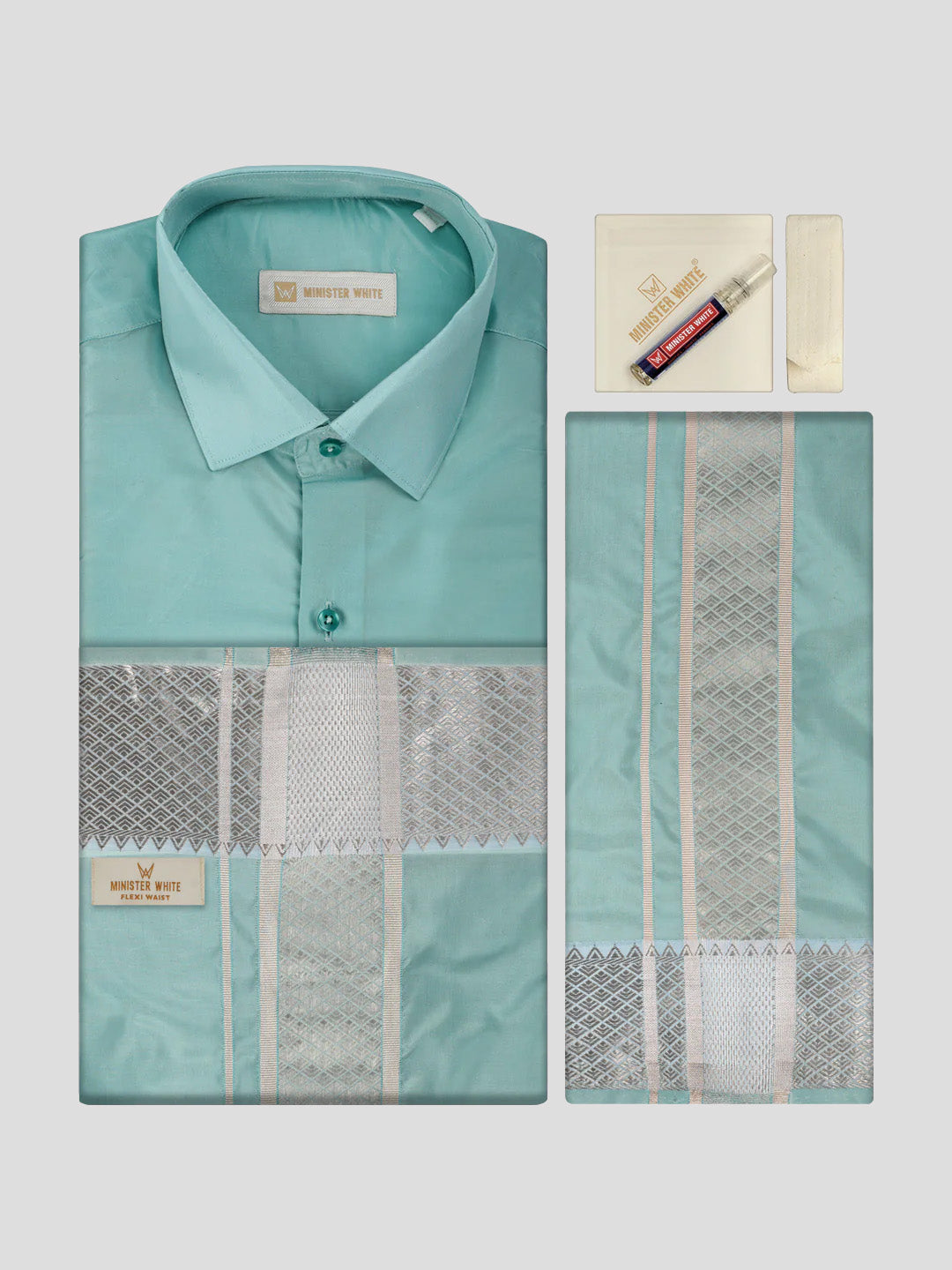 Description of Men's Plain Art Silk Sea Green Full Sleeves Shirt with 3"Jacquard Silver Jari Border Flexi Dhoti Combo Mangal