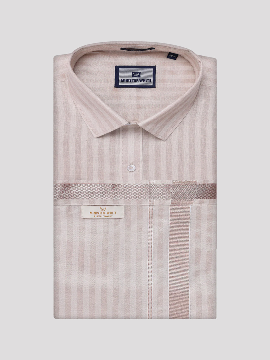 Specification Of Men's Tissue Stripes Almond Shirt & Jari Border Flexi Dhoti Wedding Combo Finely