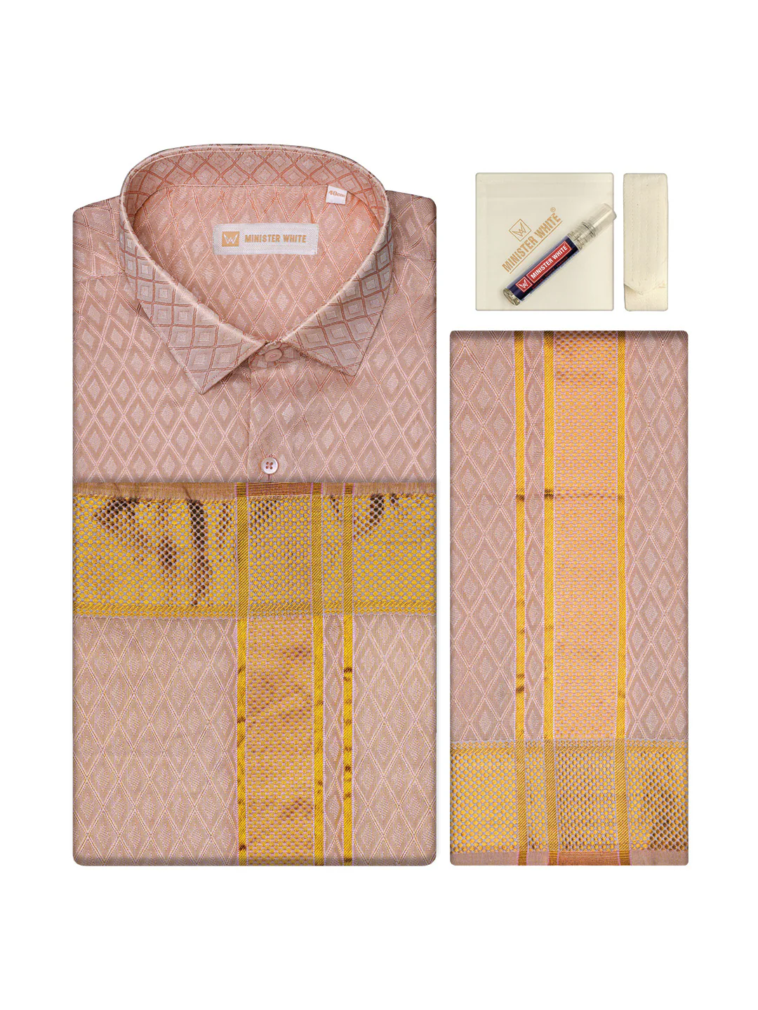 Mens Art Silk Pink Full Sleeves Shirt with 2 1/2" Gold Jari Border & Towel Dhoti Combo Spruce