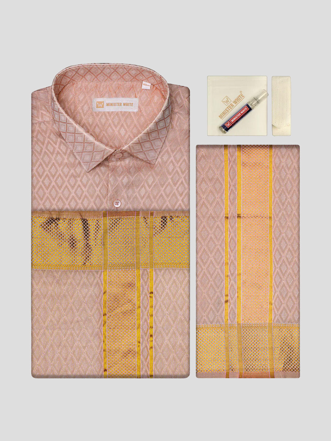Men's Art Silk Pink Full Sleeves Jacquard Shirt with 2 1/2" Gold Jari Border & Towel Dhoti Combo Spruce