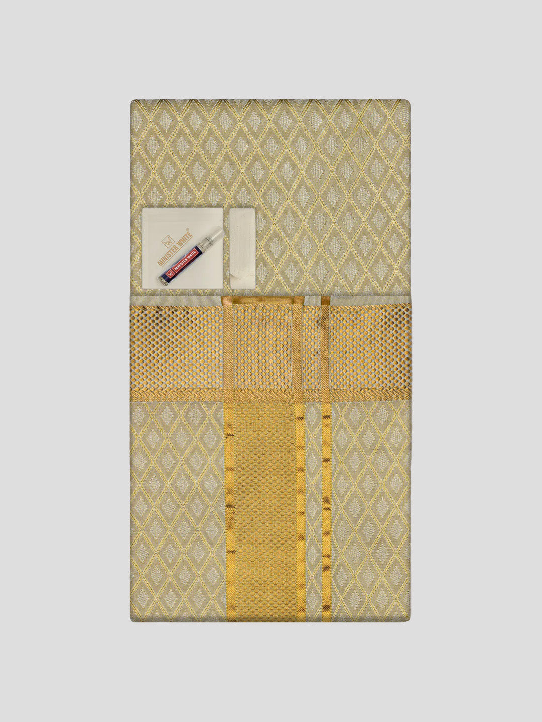 Description of Men's Art Silk Jacquard Fawn Full Sleeves Shirt with 2 1/2"  Gold Jari Border & Towel Dhoti Combo Spruce