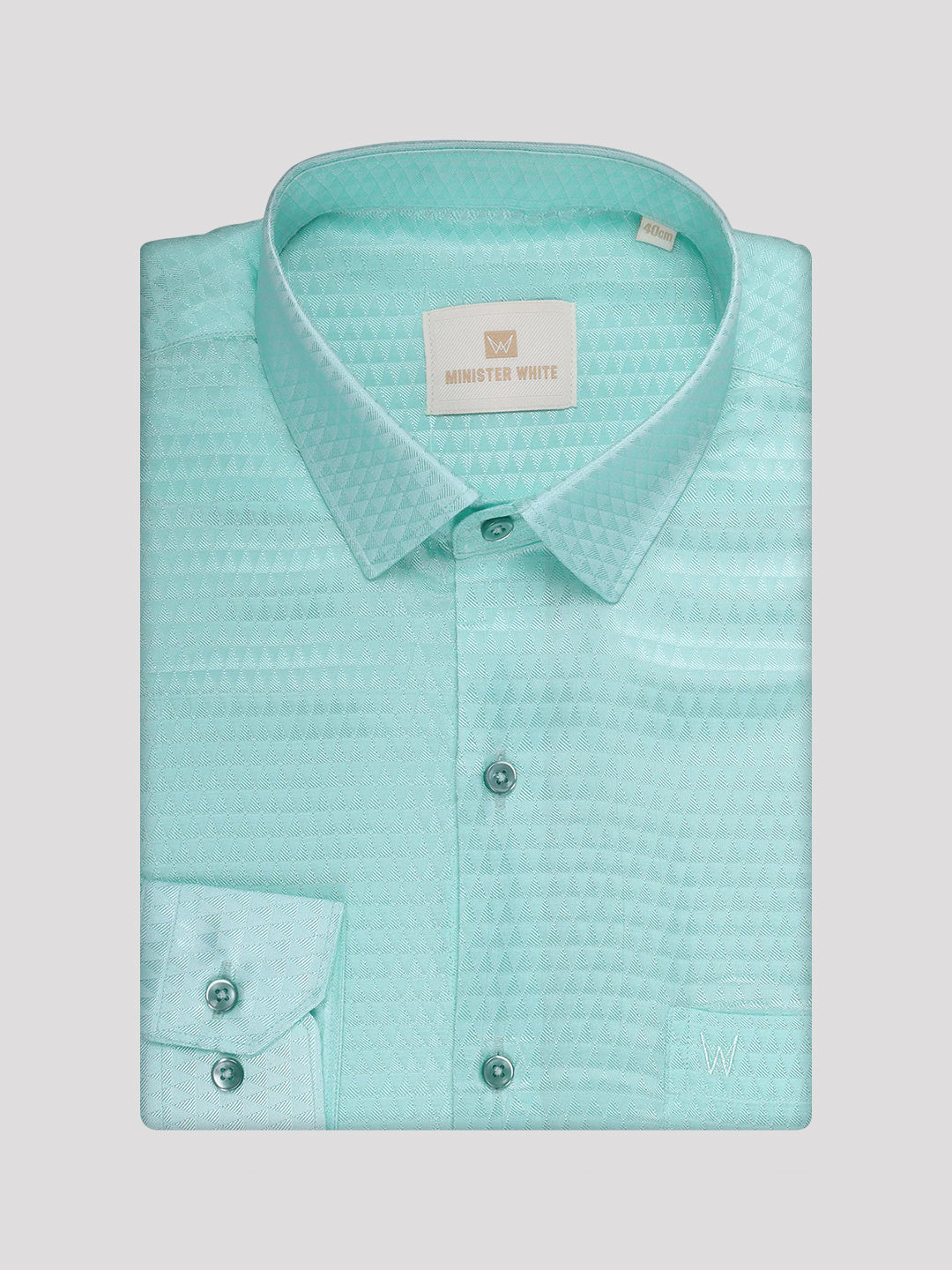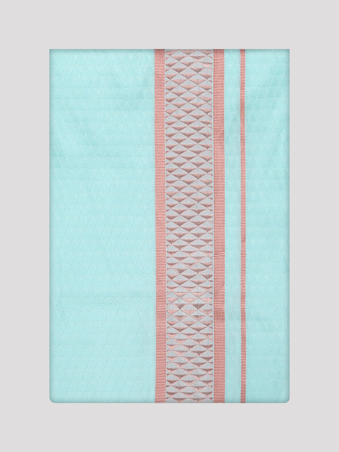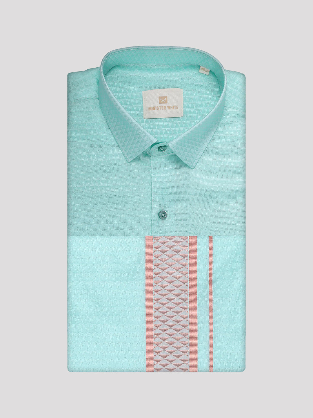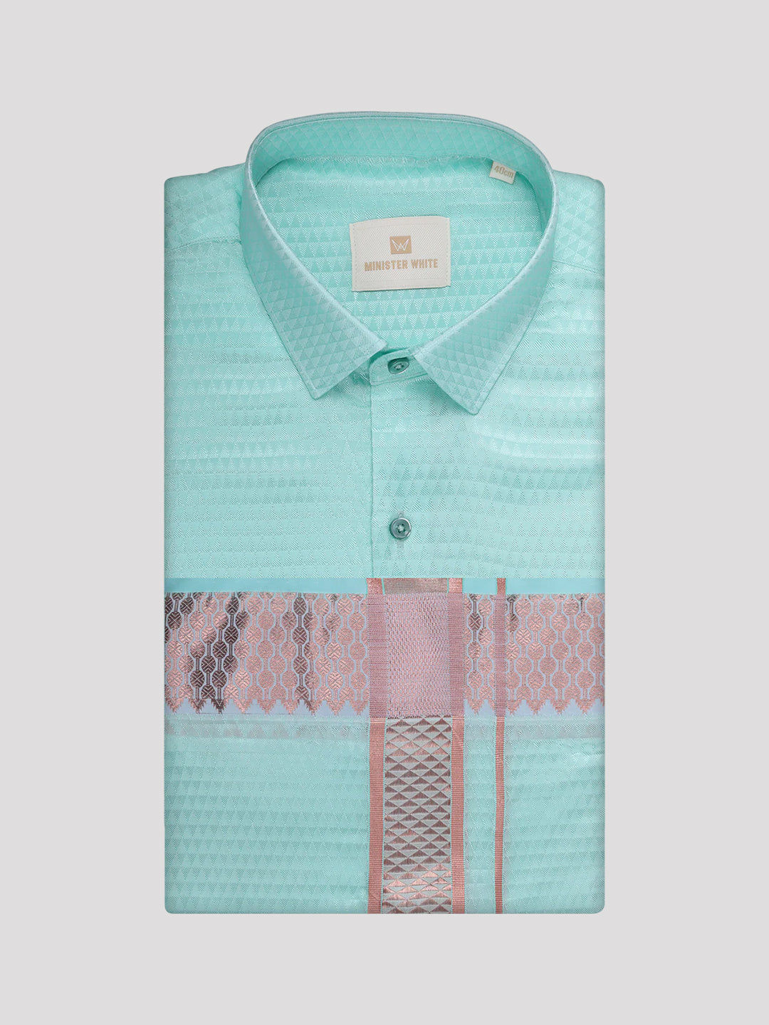 Description of Men's Art Silk Mint Full Sleeves Shirt with 2 1/2" Copper Jari Border Dhoti Combo Nautica