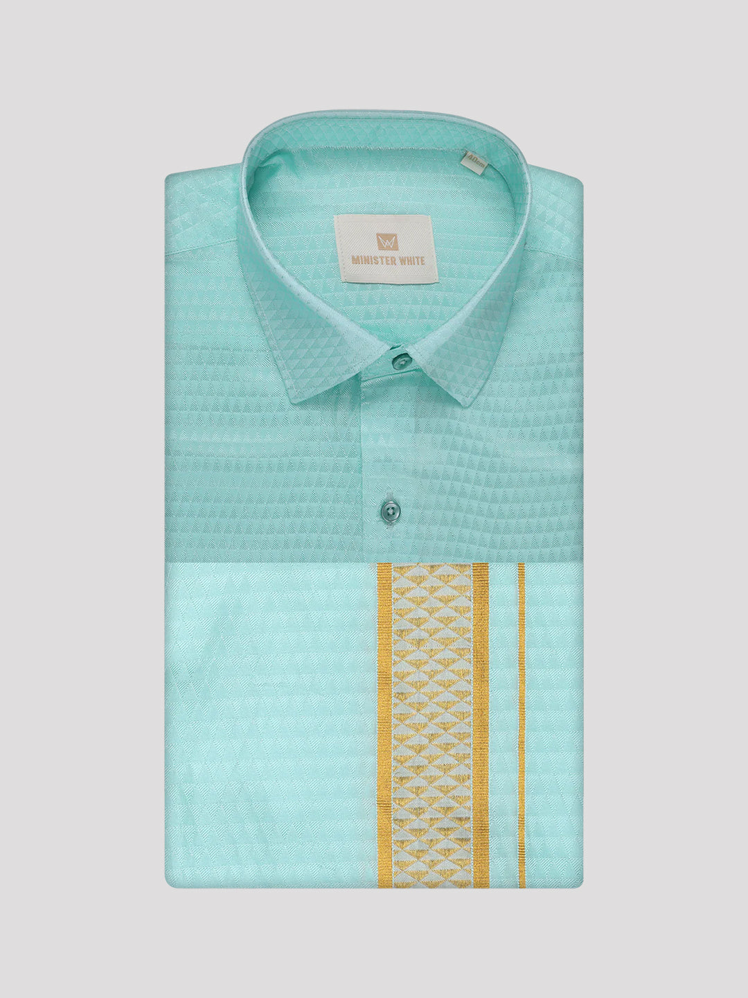 Description of Men's Art Silk Mint Full Sleeves Shirt with 2 1/2" Gold Jari Border Dhoti Combo Nautica