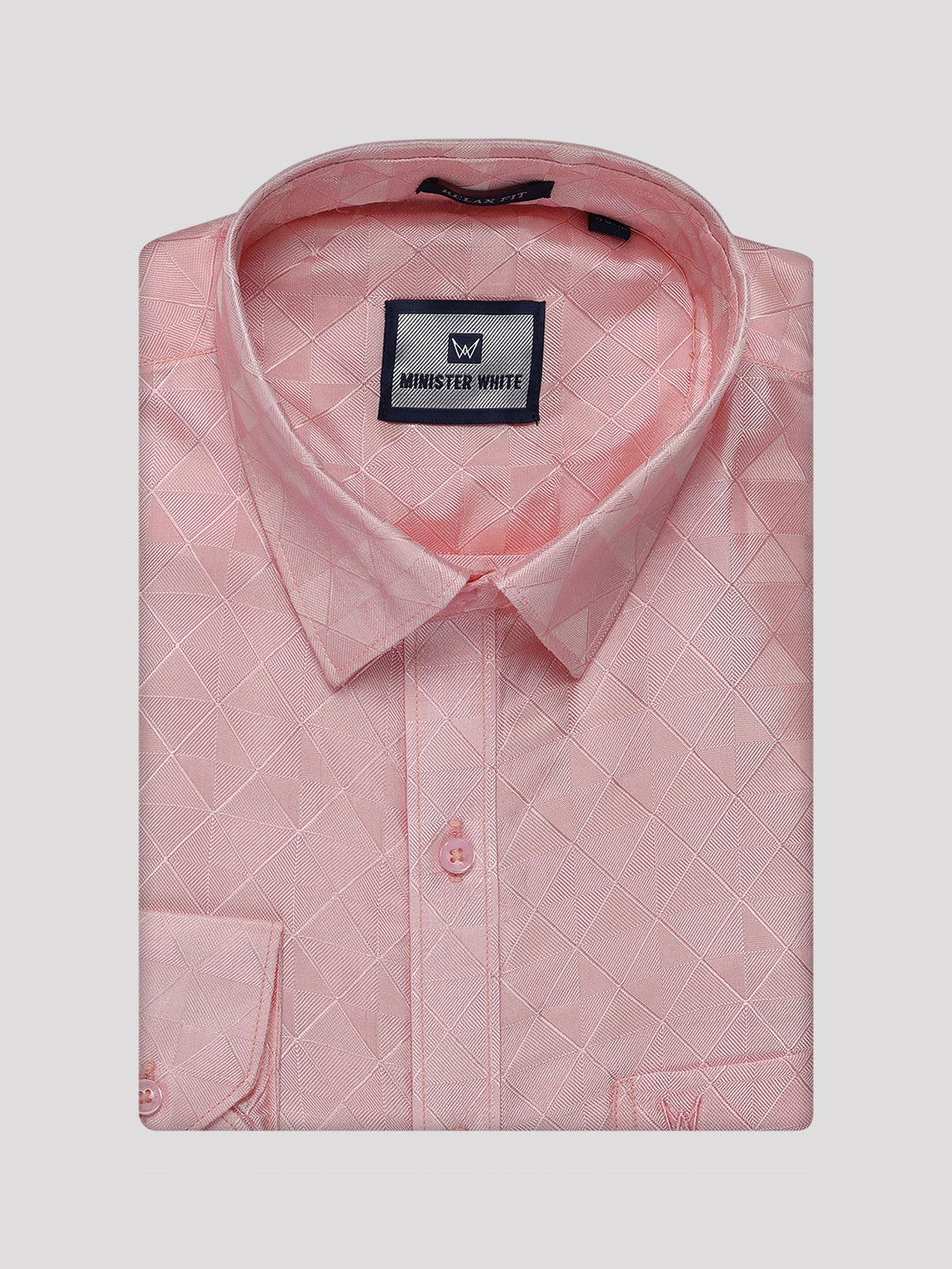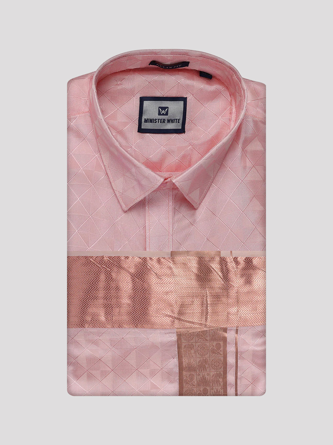 Description of Men's Art Silk Pink Full Sleeves Shirt with 3 1/2" Copper Jari Border Dhoti Combo Nautica
