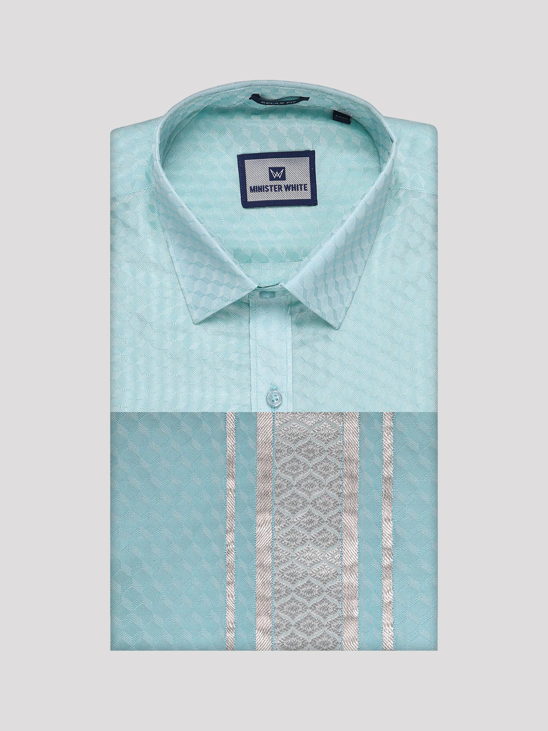 Description of Men's Art Silk Sea Green Full Sleeves Shirt with 2 1/2" Silver Jari Border Dhoti Combo Nautica