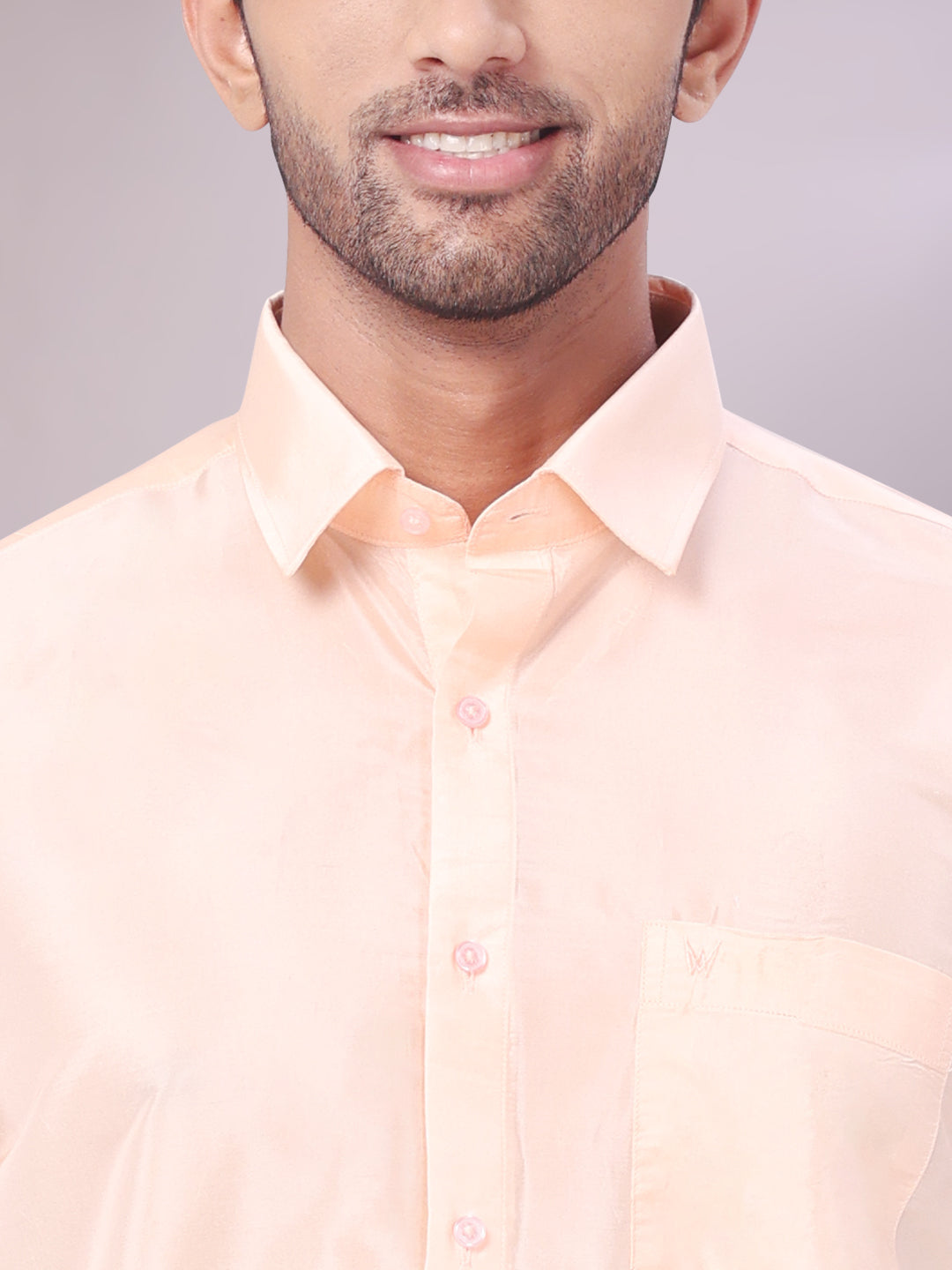 Specification Of: Mens Art Silk Light Peach Full Sleeves Shirt with Gold Jari Border Dhoti & Towel Combo Blush